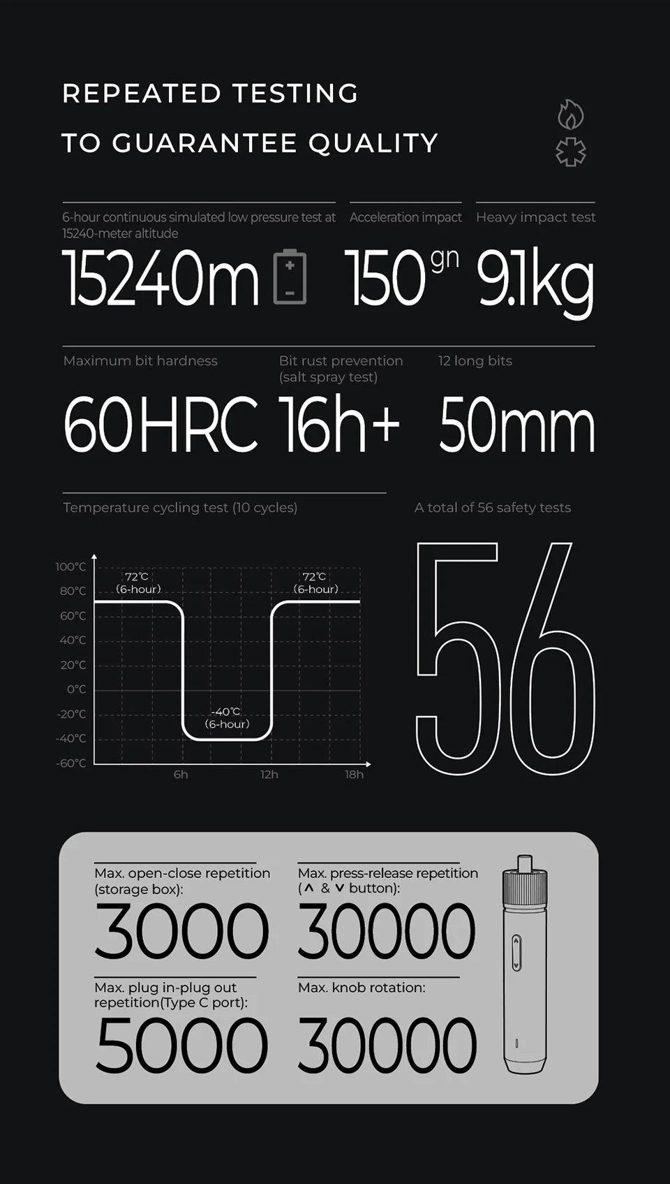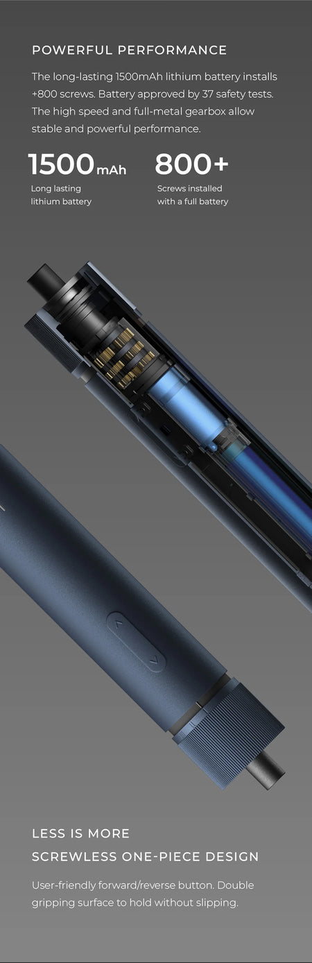 The long-lasting 1500mAh lithium battery installs +800 screws. Battery approved by 37 safety tests.