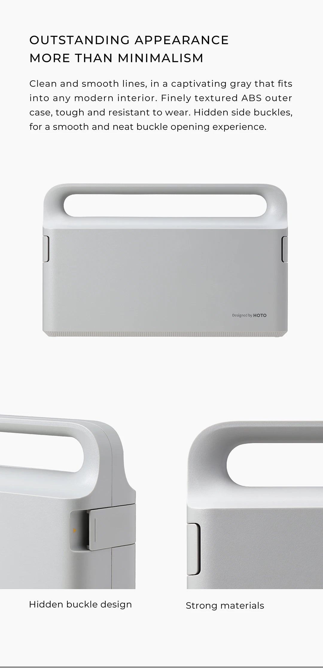 Clean and smooth lines, in a captivating gray that fits into any modern interior. Finely textured ABS outer case, tough and resistant to wear. Hidden side buckles, for a smooth and neat buckle opening experience.