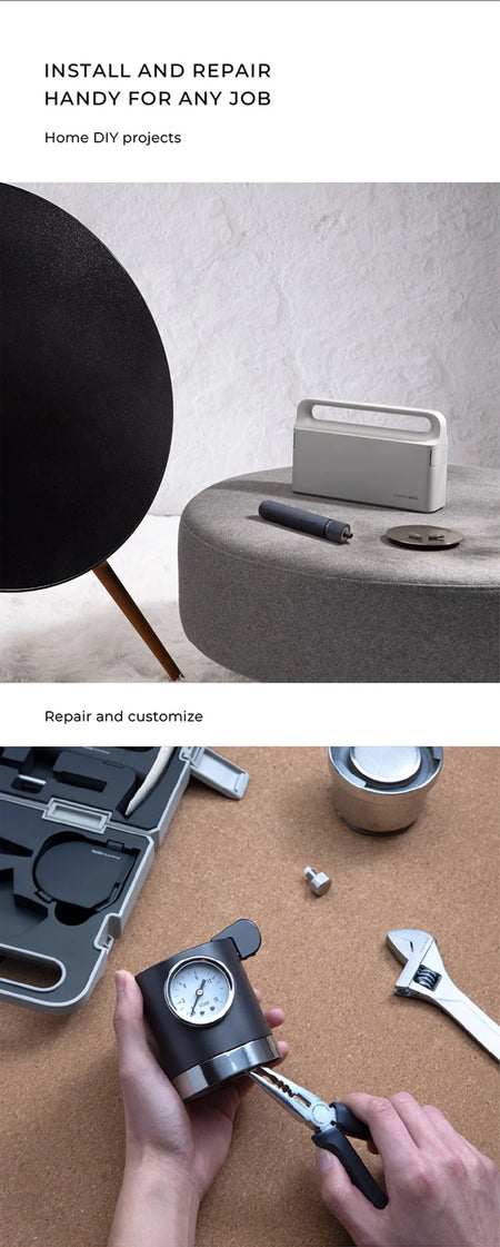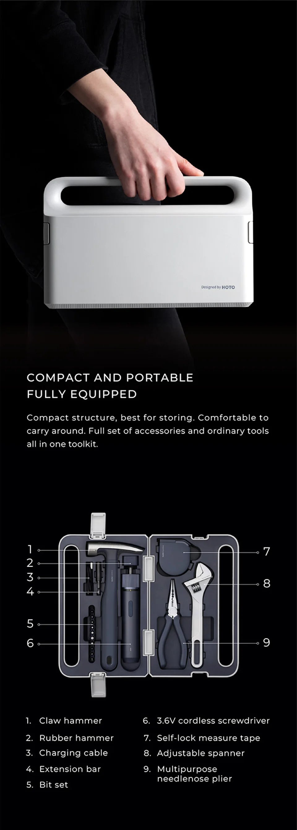 Compact structure, best for storing. Comfortable to carry around. Full set of accessories and ordinary tools all in one toolkit.