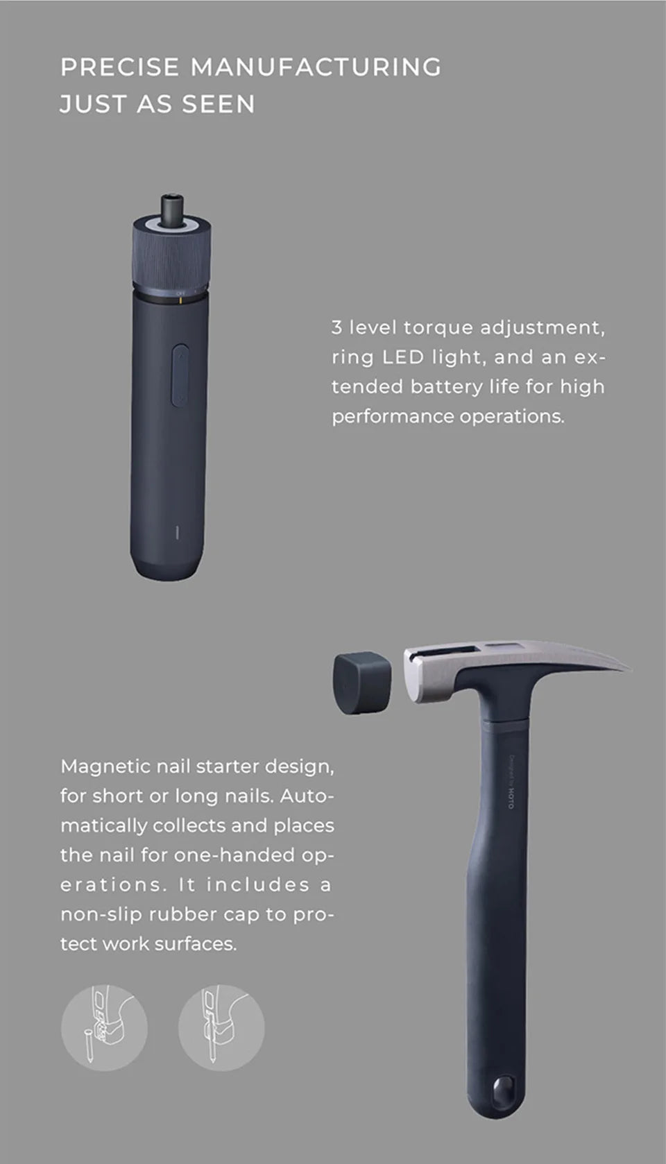 ① Electric Screwdriver:3 level torque adjustment, ring LED light, and an extended battery life for high performance operations.