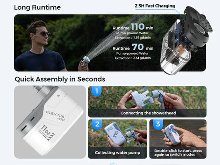 FLEXTAIL utendørs campingdusj bærbar elektrisk dusjpumpe IPX7 vanntett for utendørs dusj, bilvask, oppvask, kjæledyr