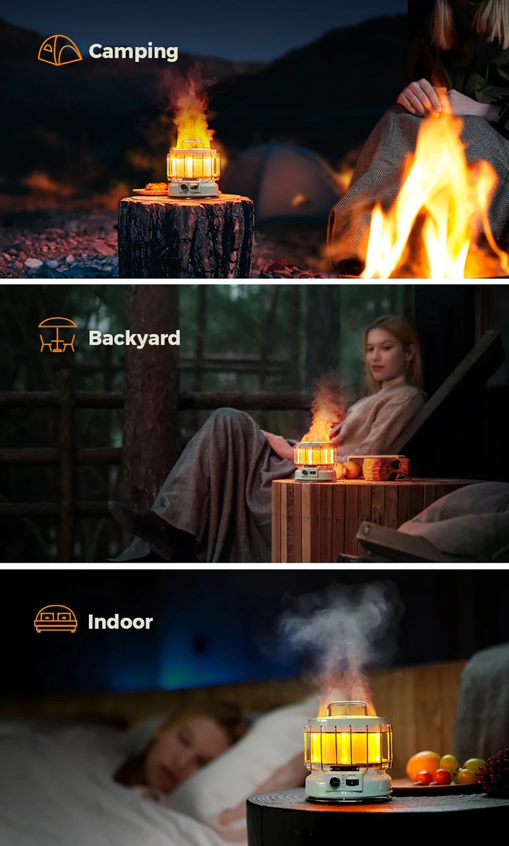 Ved å kombinere lys, skygge og tåke skapes en realistisk flammeeffekt gjennom belysning. Med brisen svaier flammeeffekten i vinden og gir en romantisk og helbredende atmosfære om natten. Det er trygt og varmt, og kan brenne når som helst og hvor som helst.