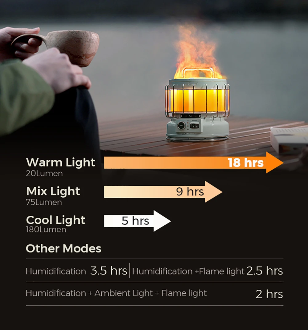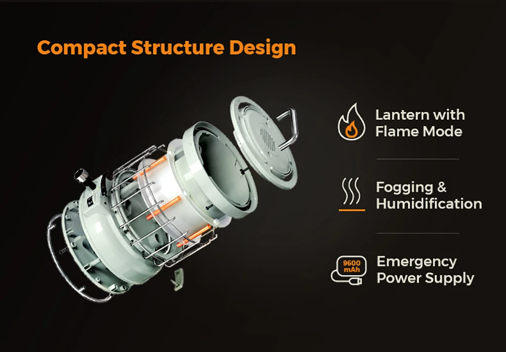 MAX LANTERN kan brukes som en separat luftfukter. Når ute- eller innemiljøet er tørt, hell bare 100 ml vann i det øverste vanninntaket og skyv bryteren til fuktingsmodus. Gir deg en mer komfortabel opplevelse.