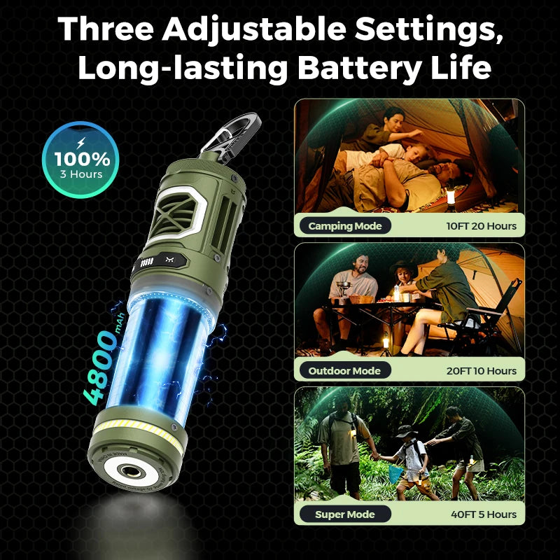 Modus : Teltmodus (20 timer) / Utendørsmodus (10 timer) / Supermodus (5 timer)