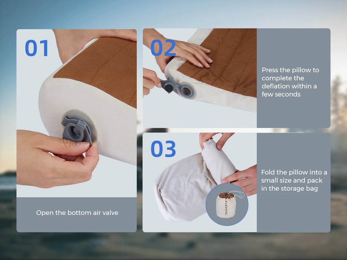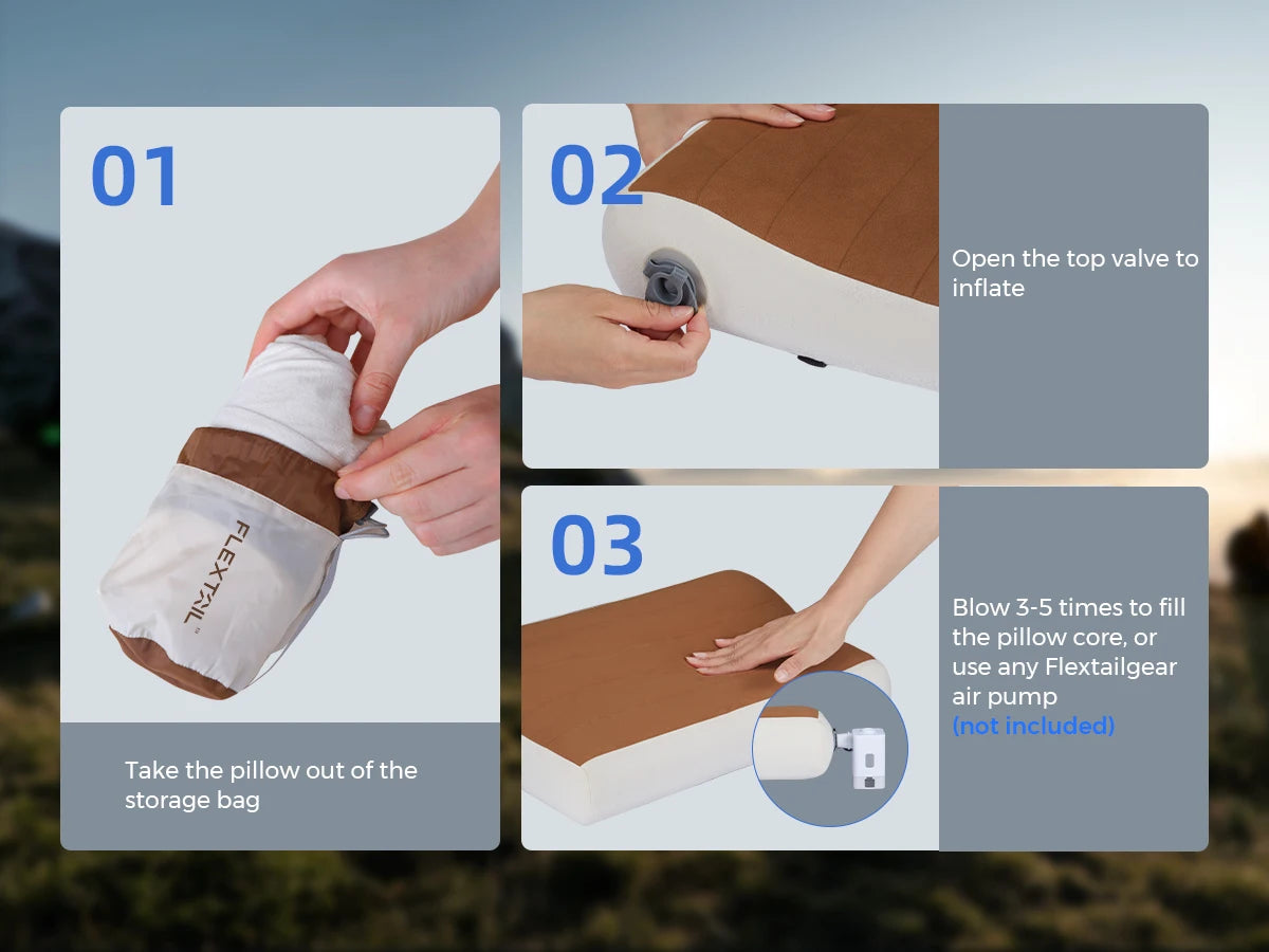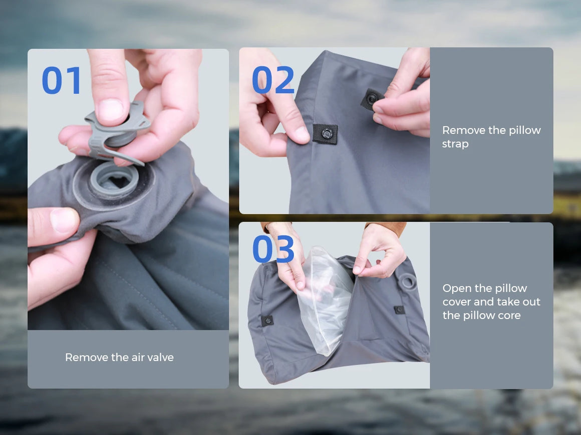 Med en brukervennlig TPU-luftventil gjør rask oppblåsing og tømming av puten det enkelt å justere fastheten. Den leveres til og med med en elastisk stropp for å feste den til enhver soveflate. Denne kompakte og vaskbare puten er perfekt for reise, camping eller hverdagsbruk.
