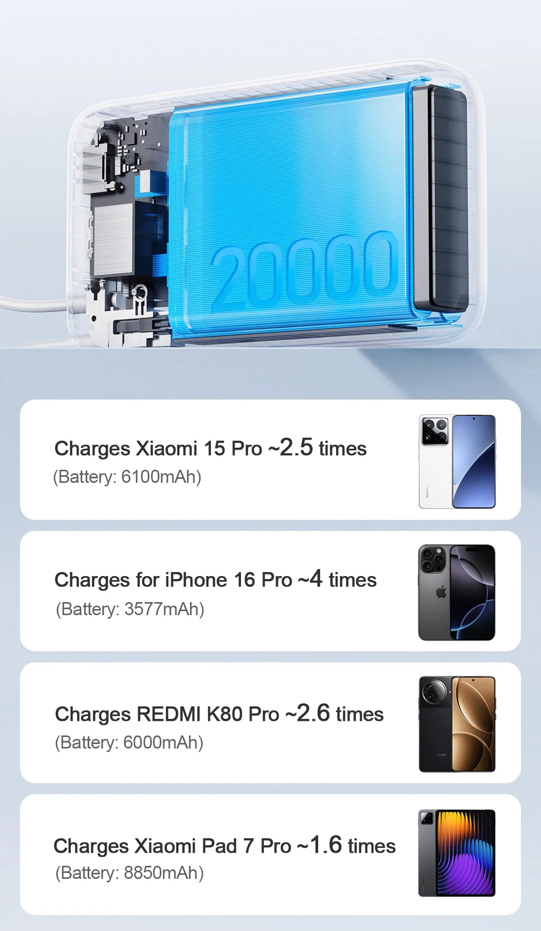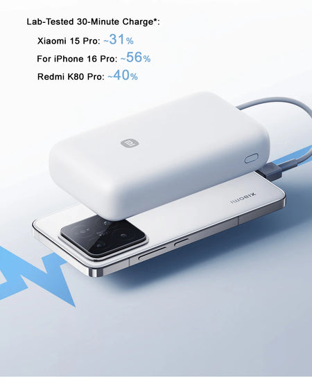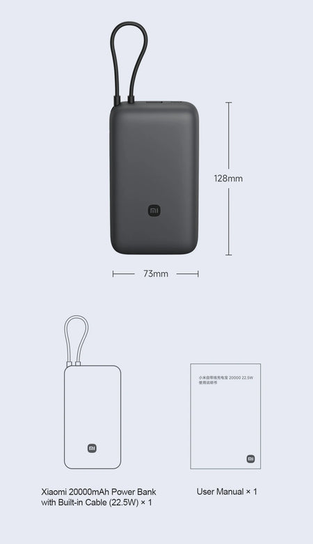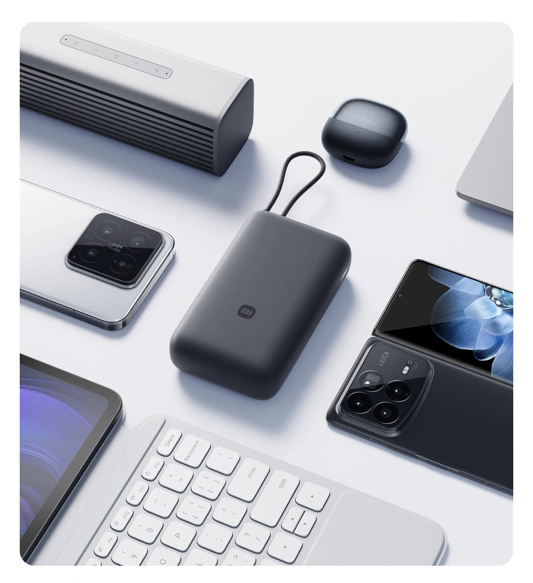 Hjem » XIAOMI 20000mAh 22,5W powerbank med innebygd USB-C-kabel, 3-porters hurtiglading, dobbel inngang/utgang, for iPhone 15 16 Pro Max